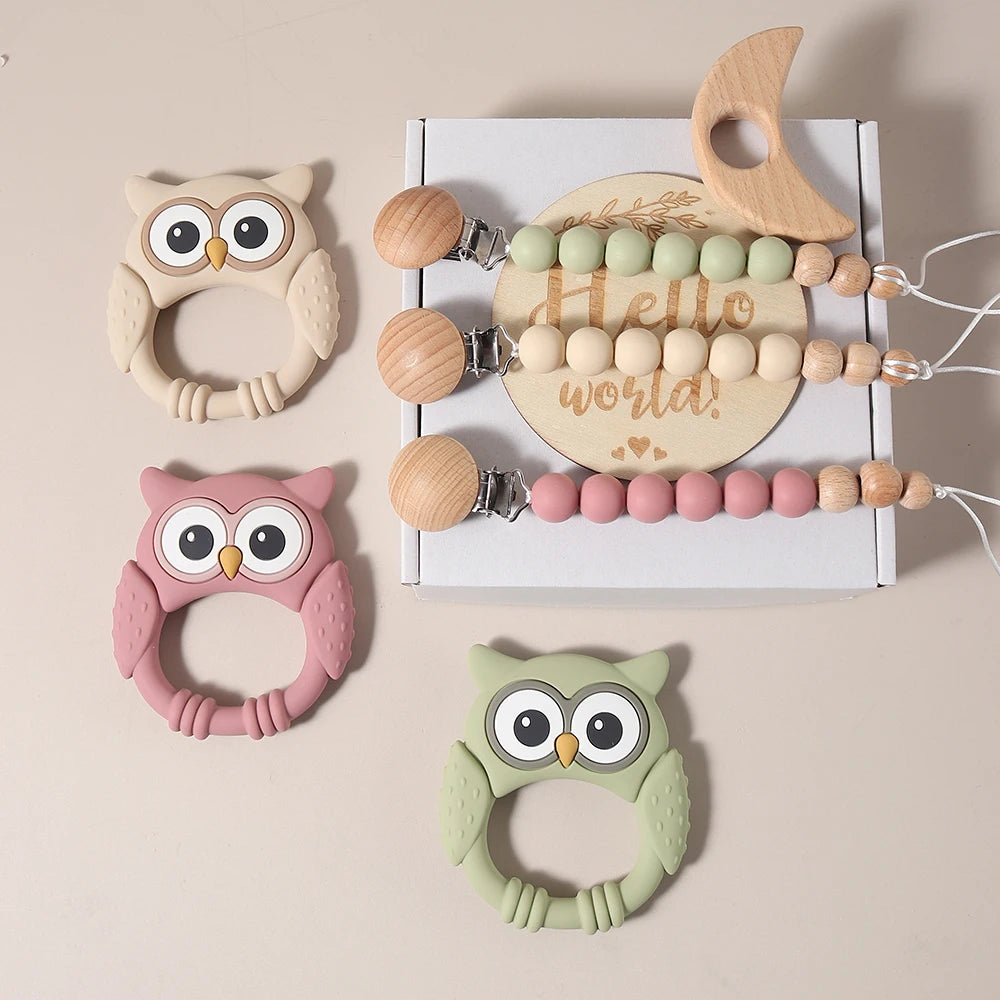 Baby gift set owl with a teething toy pacifier chain with dummy clip and wooden toy.